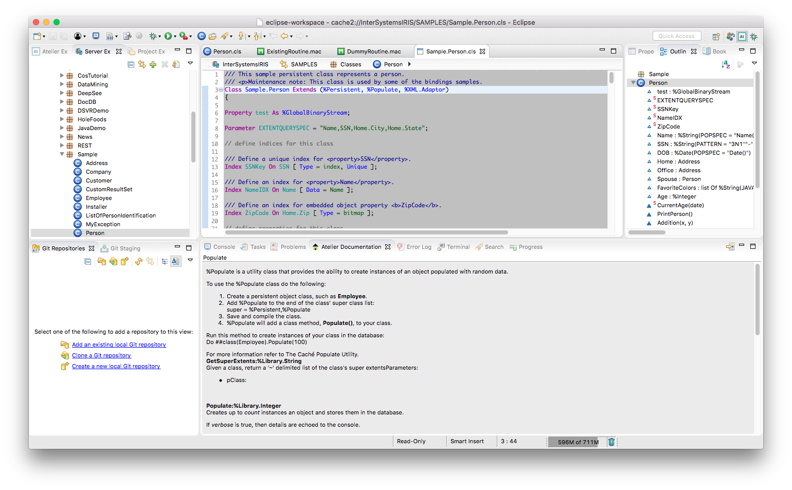 For example, I opened Sample.Person on my local Atelier client, selected the tab at the bottom for Atelier Documentation, then clicked on "%Populate" in the list of superclasses. Now I can see this in the Atelier Documentation view: