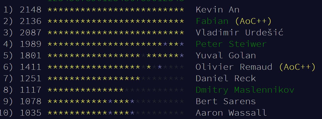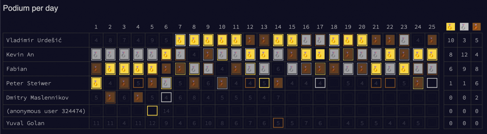 Note: You need to sign in to Advent of code (e.g. with GitHub or Google account) to see the leaderboard and participate in the contest.