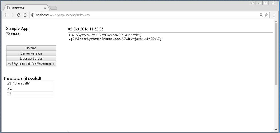 <INPUT TYPE=SUBMIT VALUE="w $System.Util.GetEnviron(p1)" STYLE="width:200;" onclick="document.forms[0].command.value = 'w $System.Util.GetEnviron';"> <BR>
