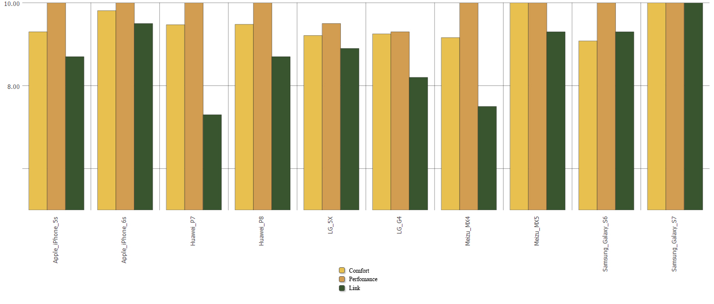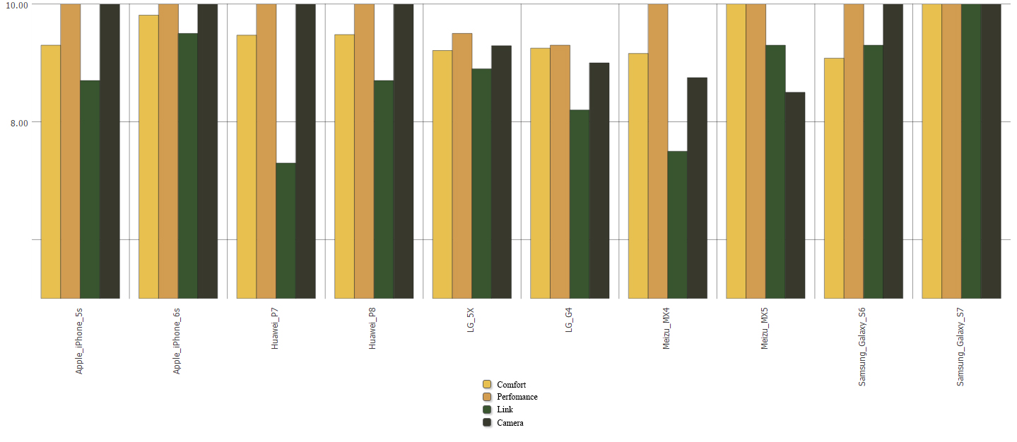 Let’s use DeepSee to check out the result. We’ve created a cube that uses the results of rating calculation by category and have built a chart for each analyzed smartphone model (Figure 6):