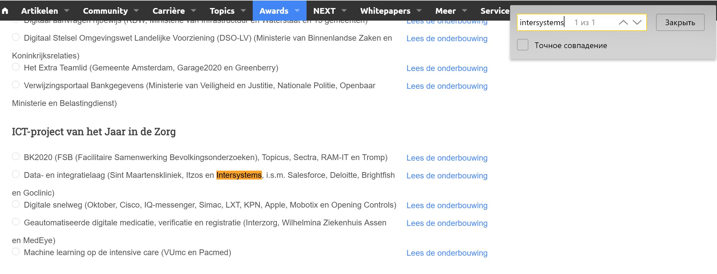 3. Use CTRL/COMMAND + F to search for InterSystems on the page, or just scroll down to the award category near the bottom “IT project of the Year in Healthcare.” Vote for the second group: