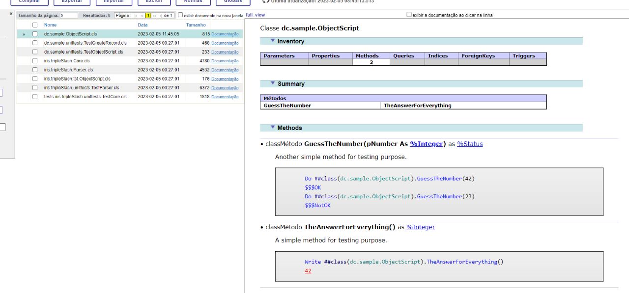 IRISAPP>Do##class(iris.tripleSlash.Core).%New("dc.sample.ObjectScript").Execute()TripleSlash will interpret this like "Given the result of the Test() method, asserts that it is equals to 42". So, a new class will be create within the unit test: