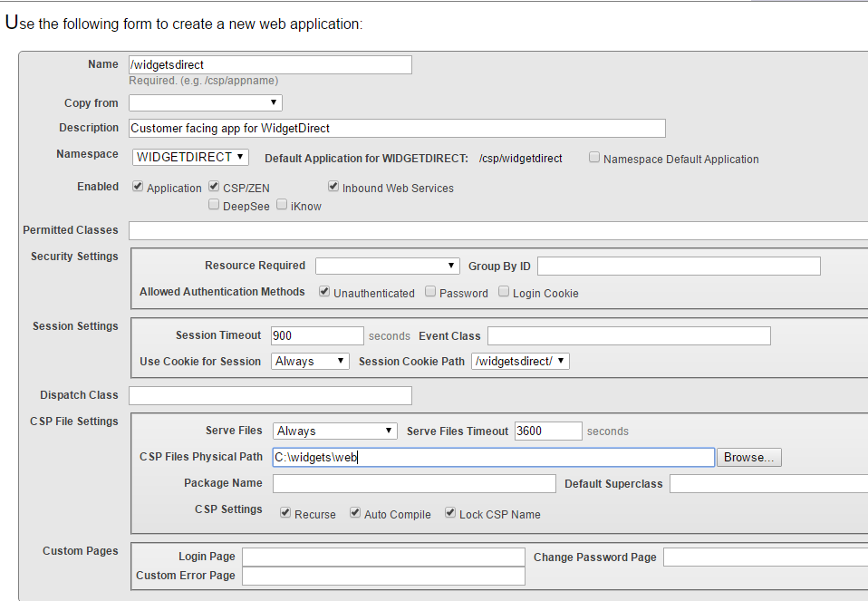 Since I set this up in a HealthShare environment, which is installed with normal security by default, I needed to adjust the web applications. I created a new namespace and database for WIDGETDIRECT, along with a new security resource. The resource (%DB_WIDGETDIRECT) has no public permissions set. Note, however, the system automatically creates a role (with the same name) that has RW privileges on that resource. So to get the REST service to work, I changed the web application by going to the Application Roles tab and adding the %DB_WIDGETDIRECT role to the application roles.