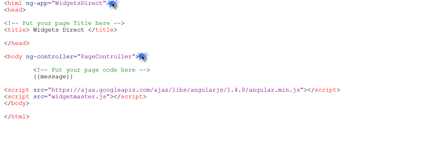 This clearly isn't what we want, so we are clearly needing some more setup. First, we need our Module and Controller code, so we need to create the javascript we mentioned in our Welcome page. We will define our Angular Module as "WidgetsDirect" and attach our first Controller "PageController" to the module. We will also pass in some useful Angular functionality to the controller, such as the $scope and the $http methods to allow us to send and receive HTTP content. When our controller is referenced, it will set the value of $scope.message (which we are displaying on the page) to the string "Hello Scope!"
