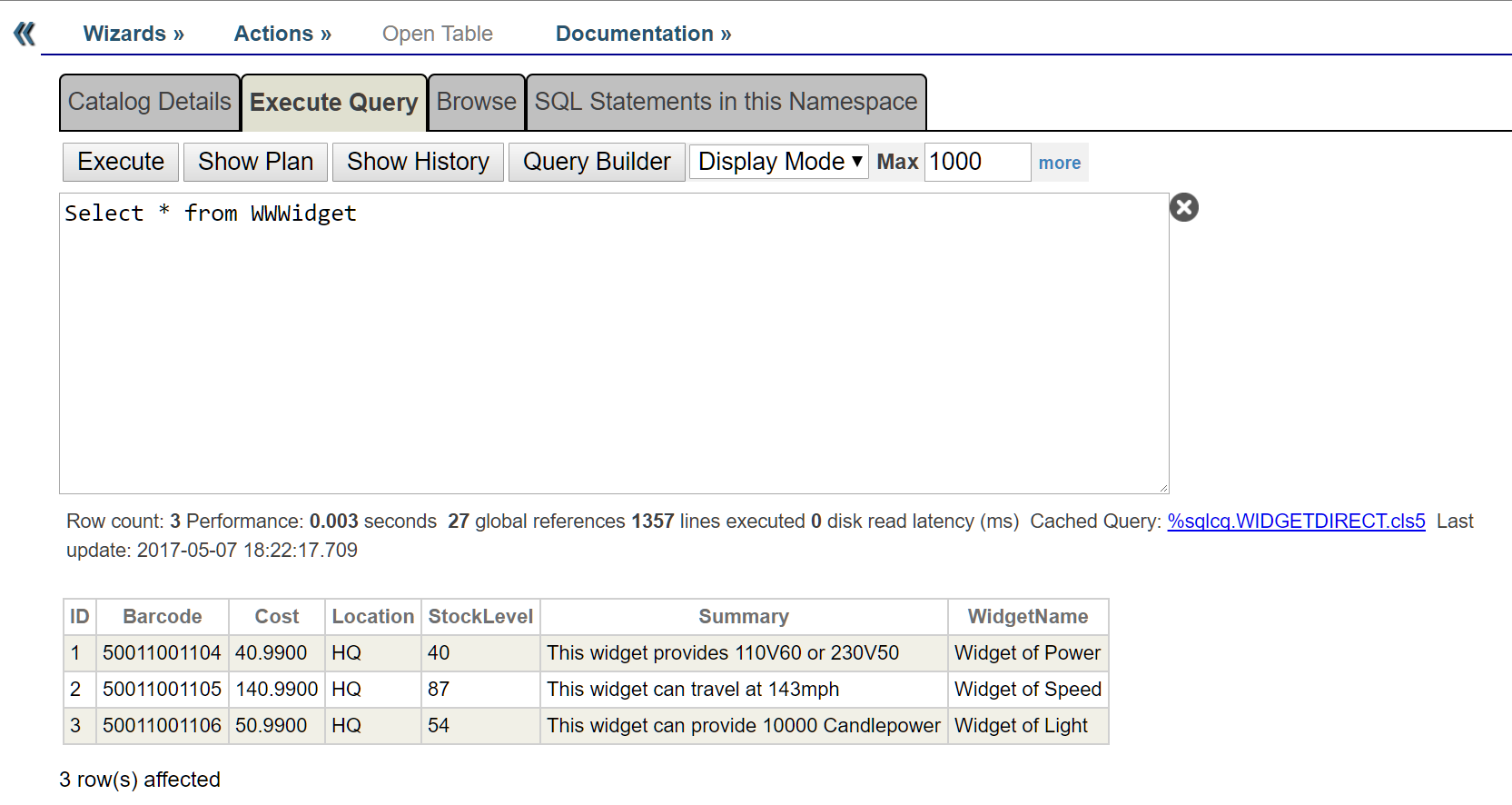 So, we have good news and bad news. The good news is at that WorldWideWidgets also use Caché, but the bad news is that their Widget table has different properties with different names than our Widget class, and we need to keep the catalogs seperate for the time being. WorldWideWidgets don't have a WidgetAccessory catalog (and they wonder why they lost the Widget War), so we don't need to worry about Accessories for now