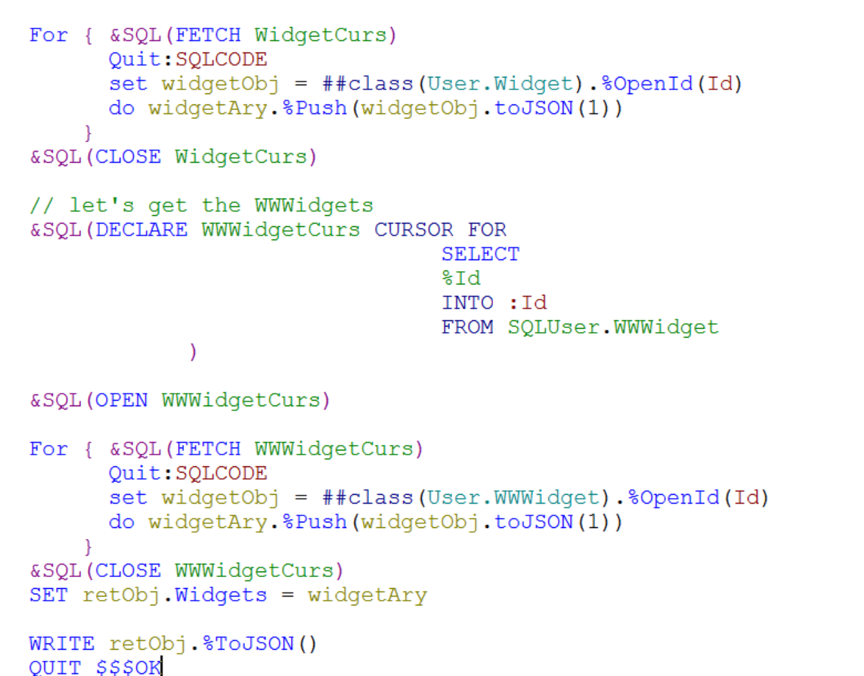 and then we will alter our REST.Widget class to return all WWWidgets in addition to our Widgets. We will implement a second cursor, and push the toJSON representations of these widgets onto our widget array.