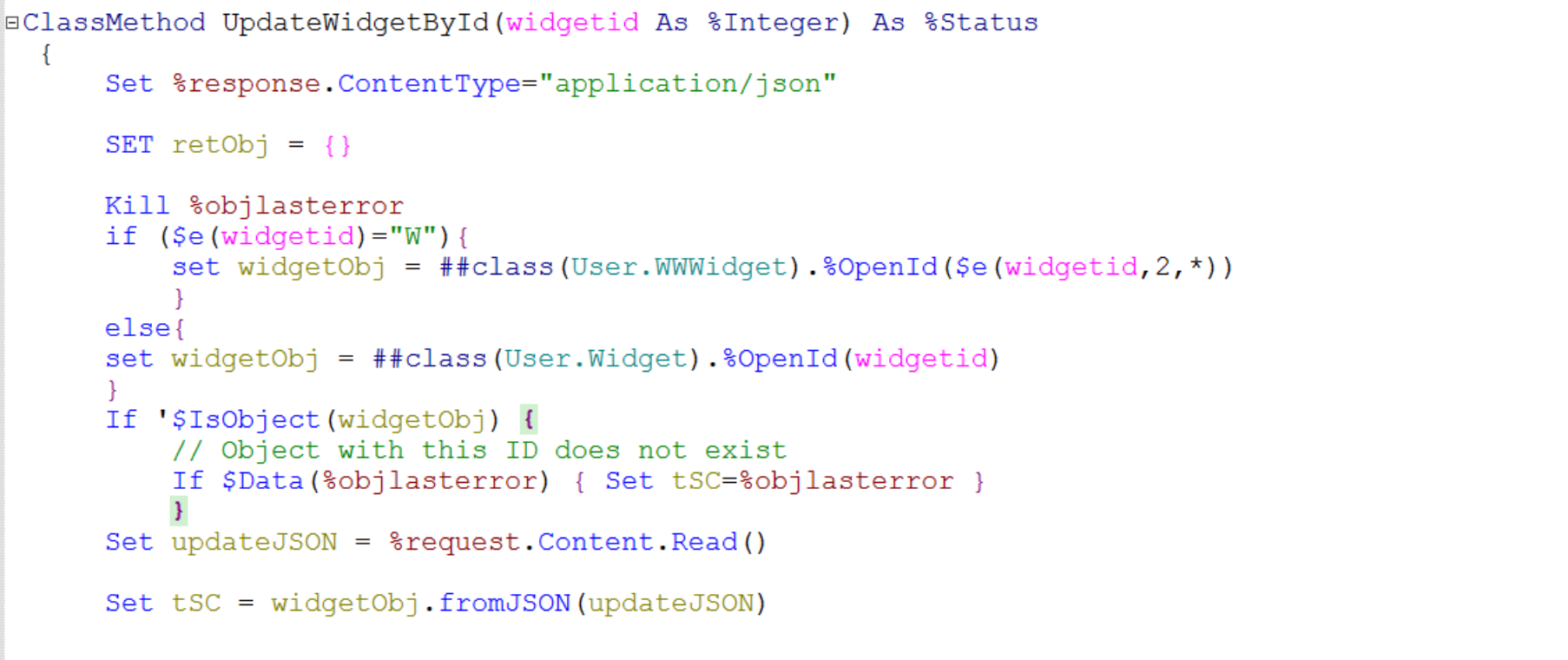 We now need to make sure our PUT service is able to choose between our 2 Widget classes. Luckily, we prepended the ID of the WWWidget class with a W, so we have an easy way to differentiate between each class. If the first character of the ID is a 'W' then we %OpenId with the rest of the ID value.