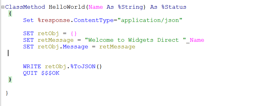 Much neater. We can now use this method to apply a JSON update to our object instance. Let's get back to our new REST.Widget class. Create the class, inheriting from the %CSP.REST superclass. We will then hook up the most common usage patterns to the appropriate verb