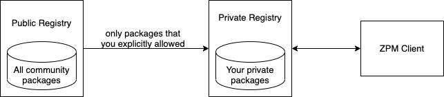 This allows to install packages from your private registry only but at the same time be able to install packages from an external registry too (Uplink).
