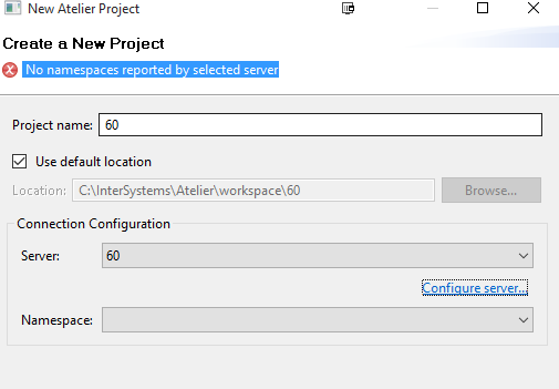 -If I then press Finish and return to the New Atelier Project wizard I see the message you reported 'No namespaces reported by selected server'.