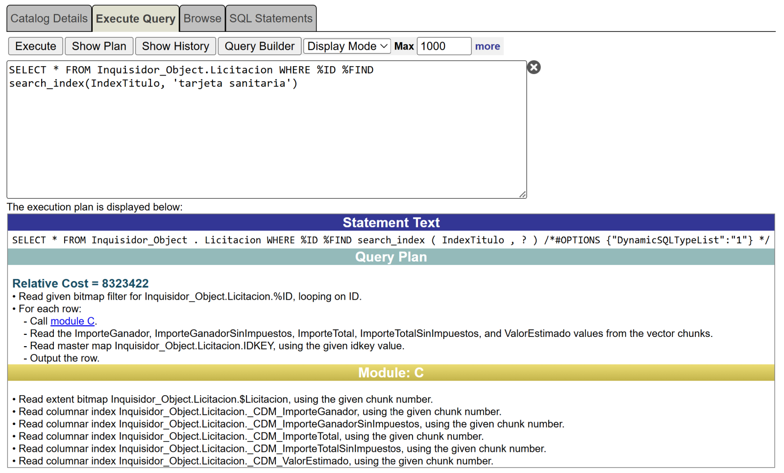 As you can see, the relative cost between the normal search and the search with the %iFind index is astronomical: 1239110280 for the query without an index versus 8323422 for the indexed query, making it 150 times faster.