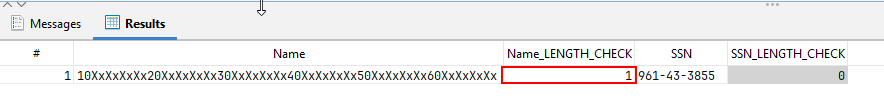 OR LENGTH(SSN) > 50If you execute this query, it will return only the rows that contain errors. In each row, the faulty cell will be marked with a 1 if the value exceeds the length defined by the metadata.