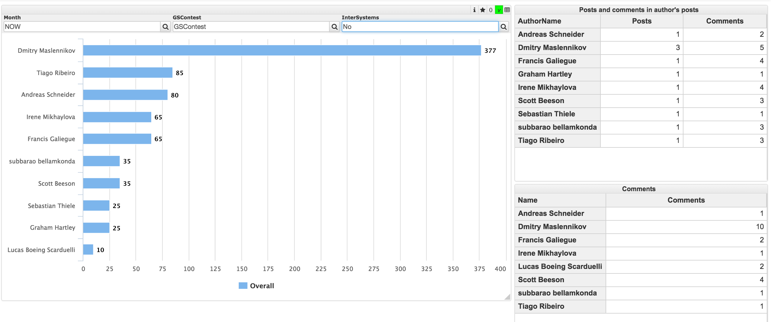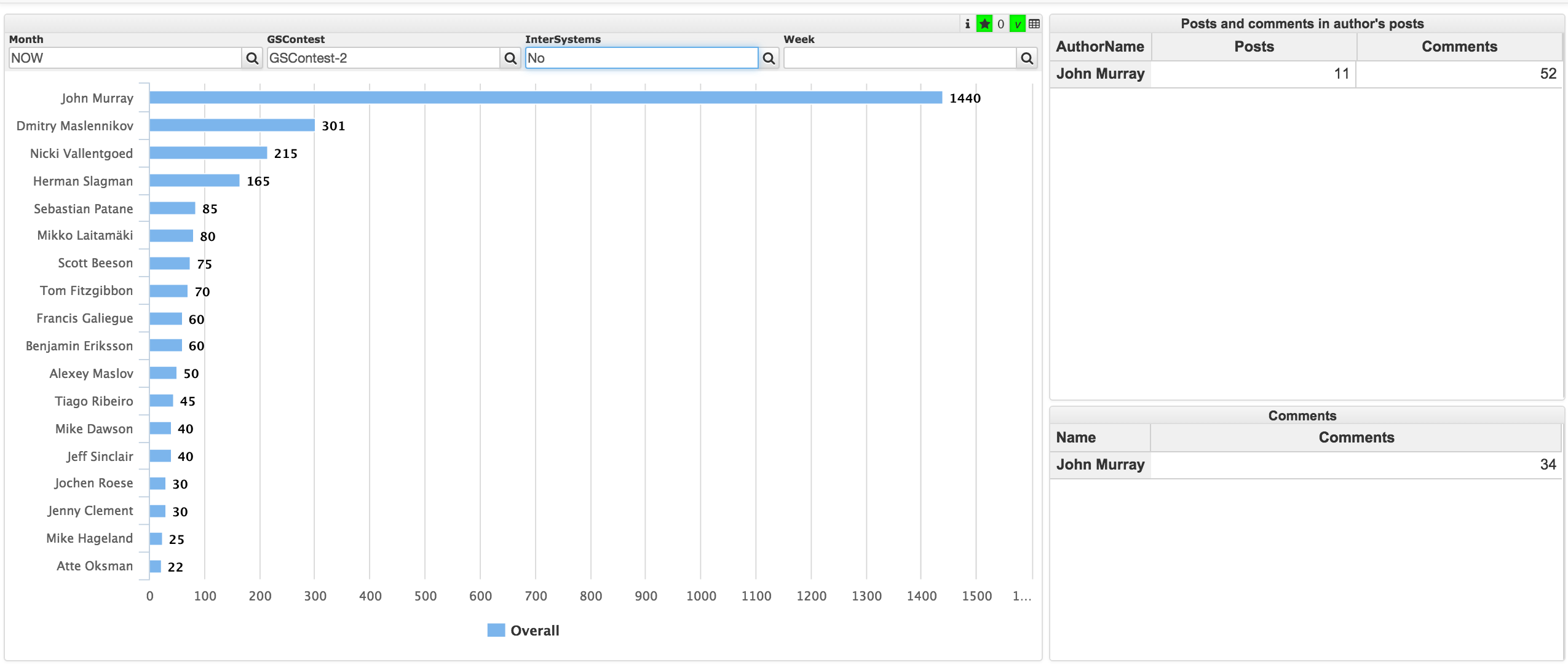 By default, it shows all the members. We added the filter to the dashboard to show leaderboard without members who are InterSystems employees.