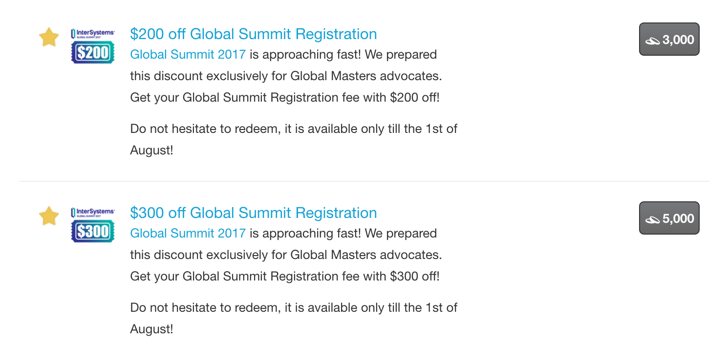 We've just introduced 2 new rewards for members of the Global Masters - $200 (3,000 points) and $300 (5,000 points) discounts for Global Summit 2017.