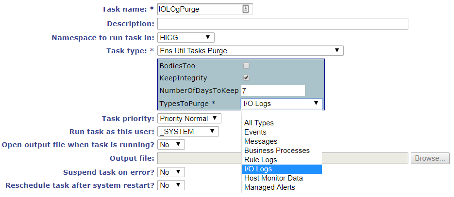 Are you sure you're looking at the right task? I/O logs would normally be purged using Ens.Util.Tasks.Purge, which is also used to purge messages, alerts, and other production logging. Here's a task I created specifically for demonstration purposes. You won't find this in your scheduled task list by default. You may have another, similar task that someone may have set up in your environment, though: