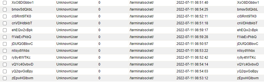 There was no /terminalsocket indeed in the web session portal before I launched a new session. However, this session does not disappear when I close the page. It even create another session for each attempt it make, so every 10 seconds. After waiting a bit (like 5 - 10 minutes), some begin to disapear.